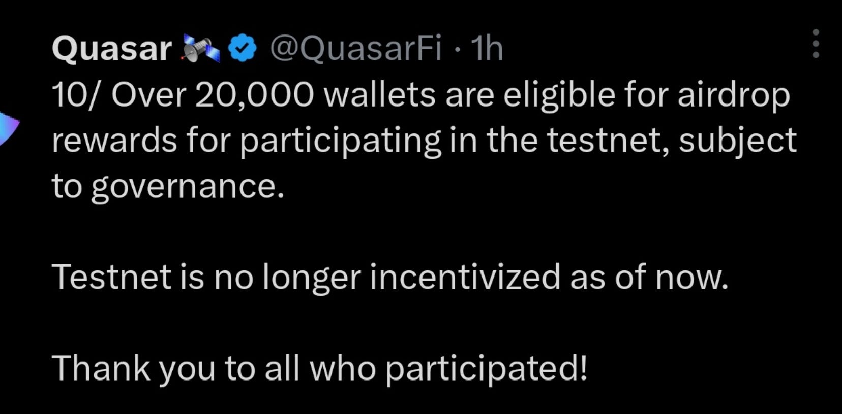 Quasar which is a project that I had on my list but unfortunately forgot about it just announced that around 20,000 testnet users will be receiving an airdrop. Unfortunately, there will be no more airdrops in the future for testnet users.